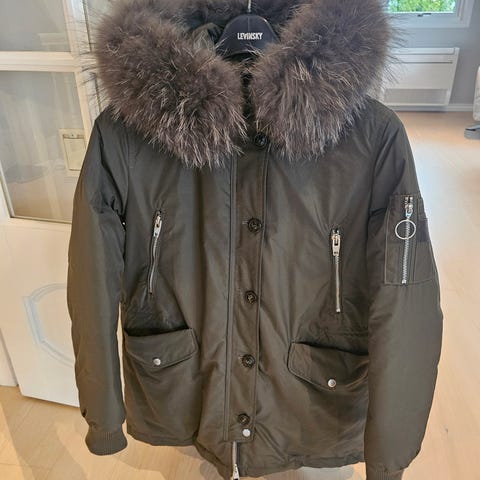 Nydelig sort dunjakke med pels. Litt liten i str