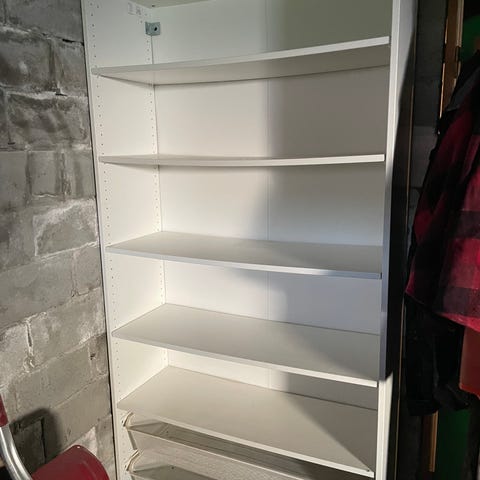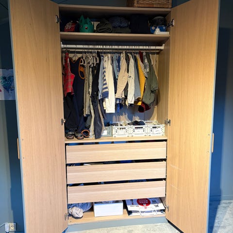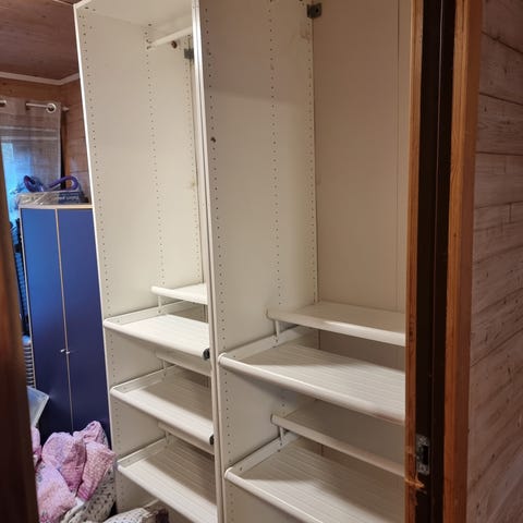 2 doble PAX Ikeaskap. To skap med stang. To med hyller øverst, og skuffer nederst (inkl. en til sko og en med glassfront) . Spegl og sota glass på dørene. 60cm dype. Hver seksjon 75 cm bred (totalt 3 m)