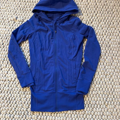 Lululemon Fitnessjakke for dame i størrelse XS. Jakken er svart og designet for trening og fitnessaktiviteter. Den har glidelåslommer og tommelhull i ermene for ekstra komfort og funksjonalitet under bruk.