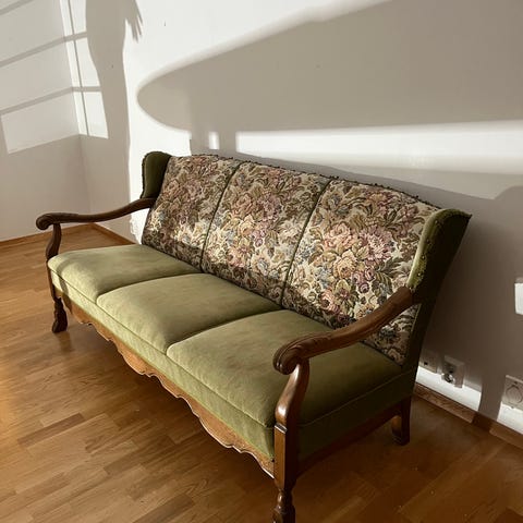 Knag sofa i såkalt jakobiner stil. Fine detaljer med skinn på armlener og topp av rygg. Fjøring i meget god stand. Veldig god å sitte i. Endel løse tråder i stoff men rent og pent . Kjøpte den selv nylig fra en dame som hadde arvet den fra sin mormor opprinnelig fra Bergen. Trolig fra 1930 tallet. Selges pga det ble for mye med 2 sofaer i min stue. Står i 2 etg i leilighet på Adamstuen. Ikke røyklukt av sofaen. Jeg har selv en liten hund men den har ikke sittet i sofaen da den har sin faste lenestol.
