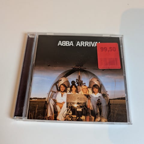 ABBA Arrival CD musikkalbum med flere spor inkludert "Waterloo", "Dancing Queen" og "Money, Money, Money". Albumet er i standard CD-format.
