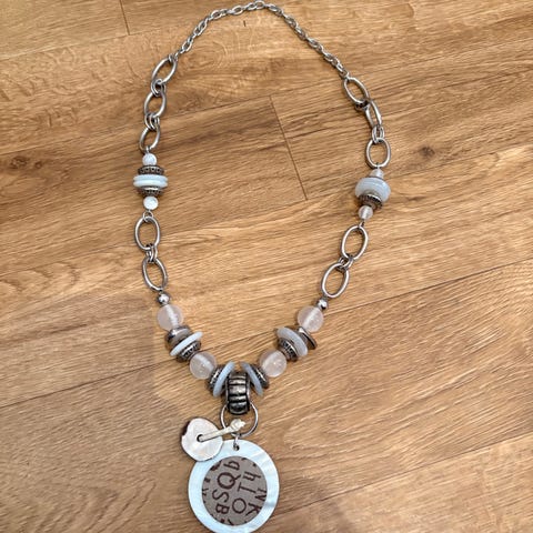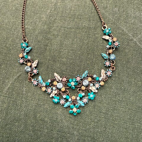 Selger et nydelig og sofistikert statement-smykke preget av glitrende krystaller i en vakker støvblå/lilla nyanse. Krystallene er slipt i en klassisk "navette"-form (bladform), som gir et veldig elegant og tidløst uttrykk.