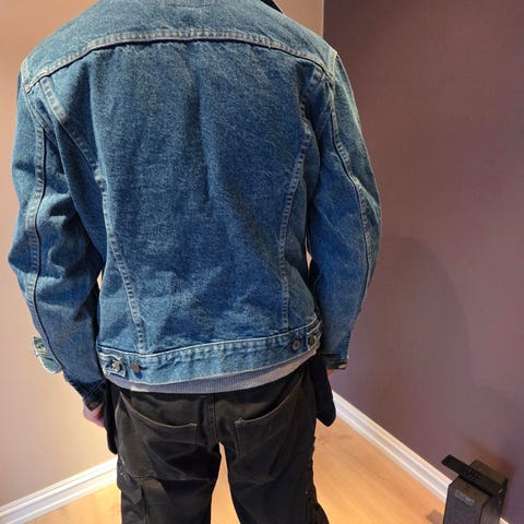 Levi's jakke i grønn cordfløyel, størrelse L. Jakken har en foret innside med mykt, lyst fôr og knappelukking foran. Materialet og designet gjør den egnet for utendørs bruk.