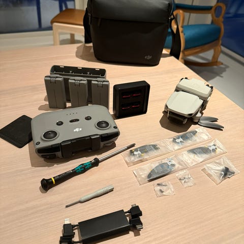 DJI Mini 2 drone med fjernkontroll, batterier og diverse tilbehør som kabler og propeller. Produktet inkluderer en oppbevaringsveske for enkel transport. Veldig lite brukt og framstår som ny.