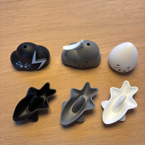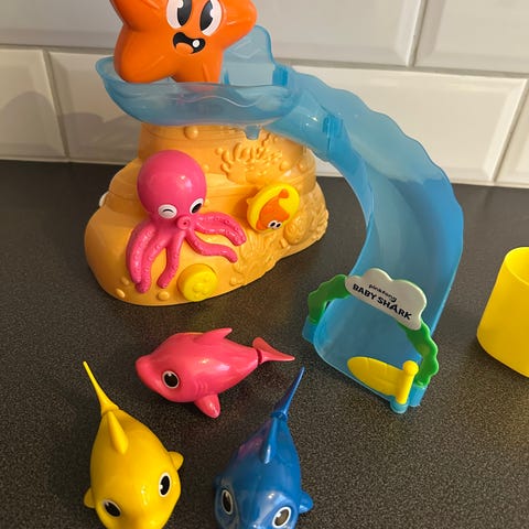Pent brukt Baby shark badeleke. Spiller musikk og svømmer i kontakt med vann, eller ved berøring av de to metalldiodene.