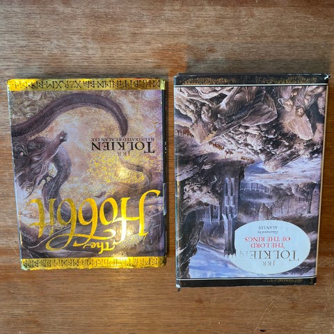 Samling av J.R.R. Tolkien-relaterte bøker og musikk CD-er, inkludert 'Ringenes Herre' guider, 'Kullervo' og 'Der Hobbit'. Bøkene og CD-ene er på ulike språk og formater, egnet for samlere eller fans av Tolkien-verdenen.