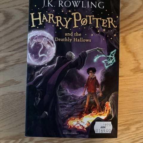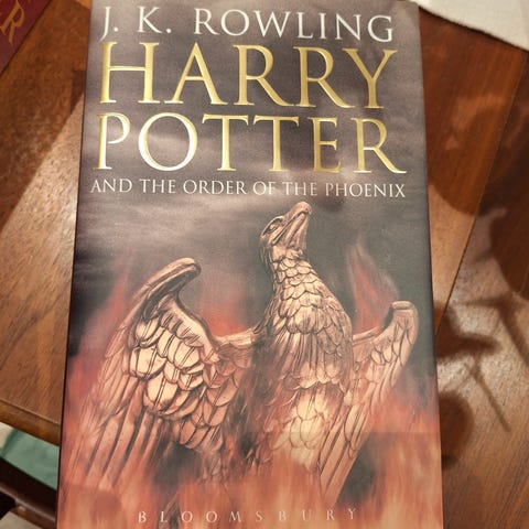 J.K. Rowling Harry Potter and the Order of the Phoenix bok. Inneholder historien om Harry Potter og hans opplevelser i femte år ved Galtvort skole for hekseri og trolldom. Boken er i paperback-format med rød og svart omslag.