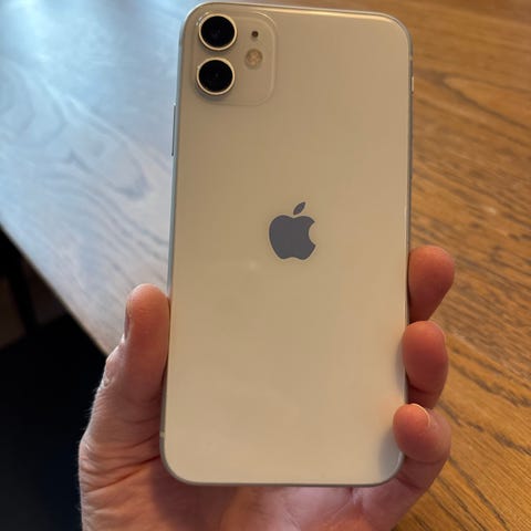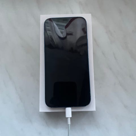 Apple iPhone 12 mini mobiltelefon med 64 GB lagringskapasitet i blå farge. Bruksmerker rundt kantene som man kan forvente av en mobil som er blitt brukt i flere år.