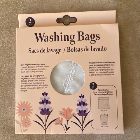 Sett med tre vaskeposer i fargene sort, hvit og grå. Hver pose har tekst for sortering av mørk, lys og farget tøy. Laget for å organisere klesvask effektivt.