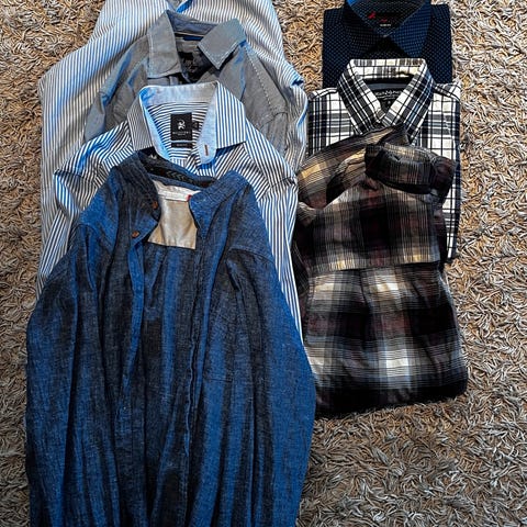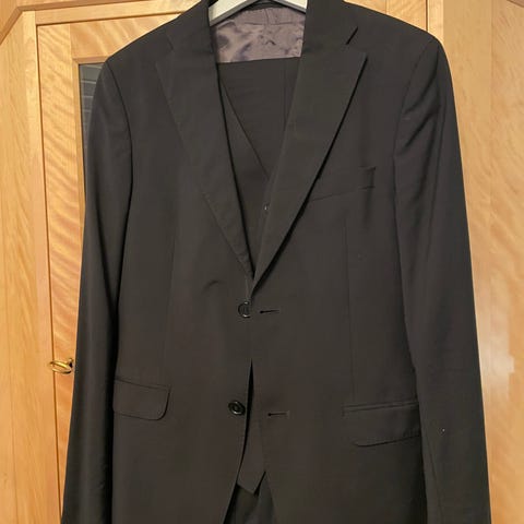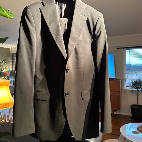Dressjakke er av uvisst størrelse, men passer ish til meg som er 177cm og bruker medium/large t-skjorter.