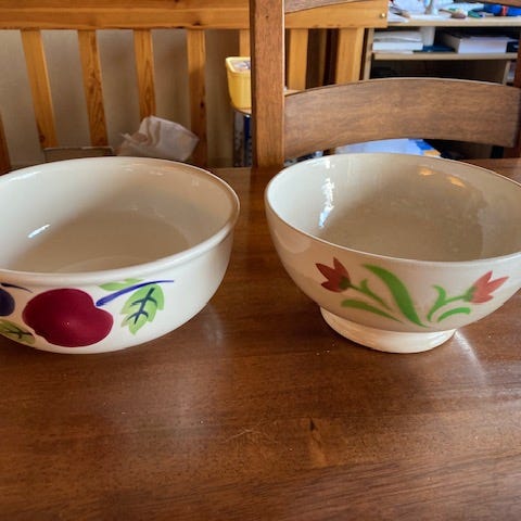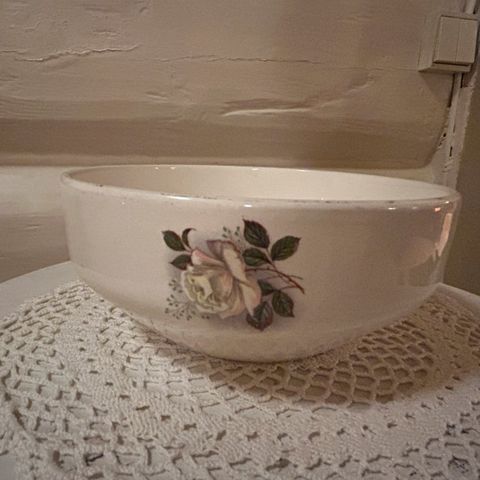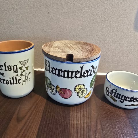 Egersund potetbolle/bolle med lokk. Jeg tror den er fra Egersund og typen Tana. Noe utydelig mønster, men ellers i fin stand.