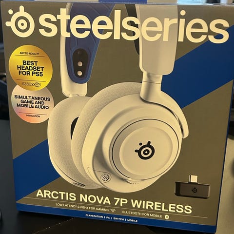 Selger et SteelSeries Arctis 7P+ trådløst gaming-headset i hvit farge, designet for PlayStation 5, men også kompatibelt med flere plattformer.