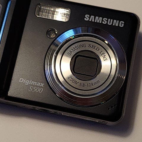Funksjonelt digitalkamera fra 2005 med et noe røft ytre. Kameraet fungerer som det skal på tross av sitt slitne utseende.