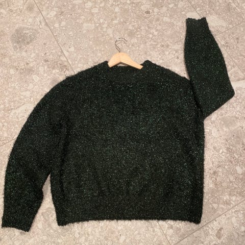 Nydelig genser litt fluffy med glitter selger den da den er litt kort