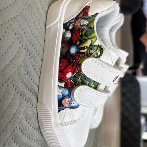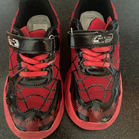 Litt møkkete/flekker/mørkere men ingen slitasje eller skader. Fine sko til en liten Marvel fan.