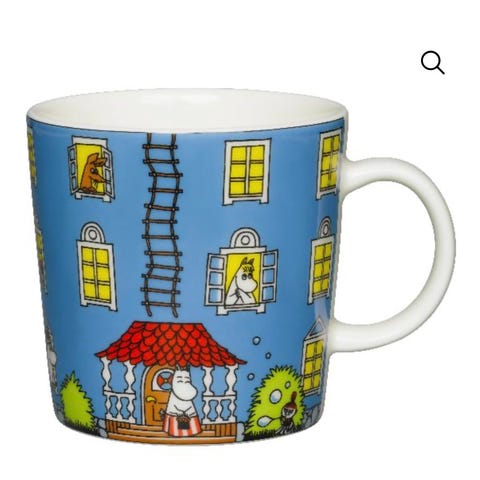 Arabia Moomin kopp med blå bakgrunn og motiv av Mummifamilien. Laget i keramisk materiale, egnet for daglig bruk.