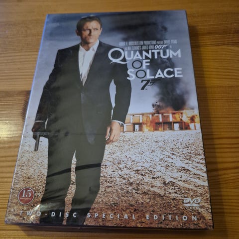 Quantum of Solace DVD 2-disc Special Edition med ekstramateriale. Inneholder filmen Quantum of Solace og ekstra innhold som dokumentarer og slettede scener. Passer for aldersgruppen 15 år og oppover. Norsk tekst.