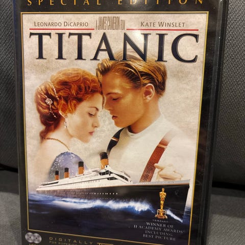 Titanic Spesialutgave DVD 2-disc sett med ekstramateriale. Inneholder filmen Titanic samt tilleggsinnhold. DVD-format. Norsk tekst.
