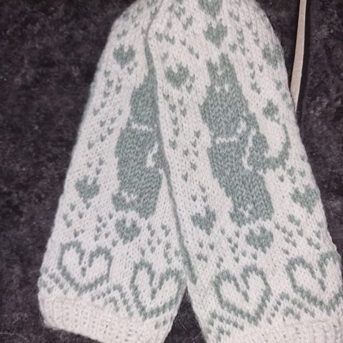 Mummi votter strikket I Rauma finull garn. Fargene er olivengrønn og hvit