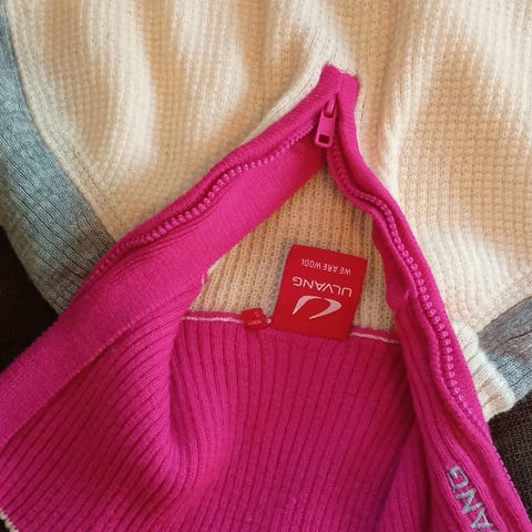 Ulvang genser med høy hals (glidelås i hals), str L offwhite og aubergine. Prøvd, men ikke brukt. Ekstra lange mansjetter på ermene med hull til tommel.