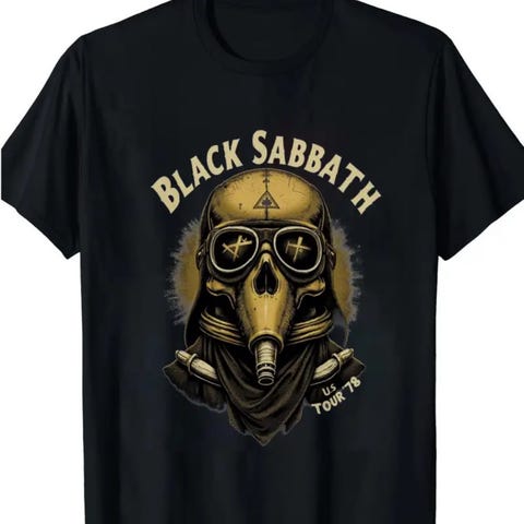 langermet t-skjorte i beige farge, størrelse XXL for herre. Laget av bomullsmateriale. T-skjorten har trykk med Black Sabbath-motiv på front, ermer og bakside. Viser noe slitasje og flekker på stoffet. Unik genser, du ikke ser ofte.