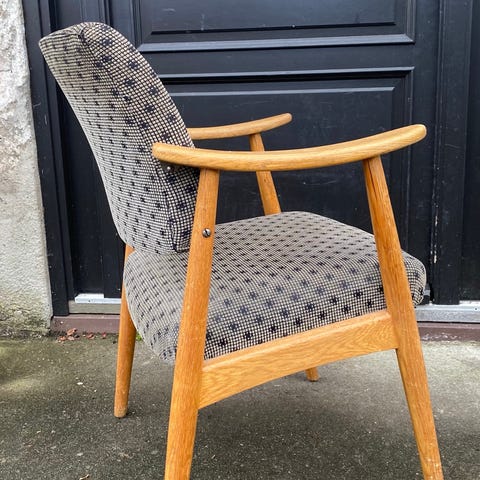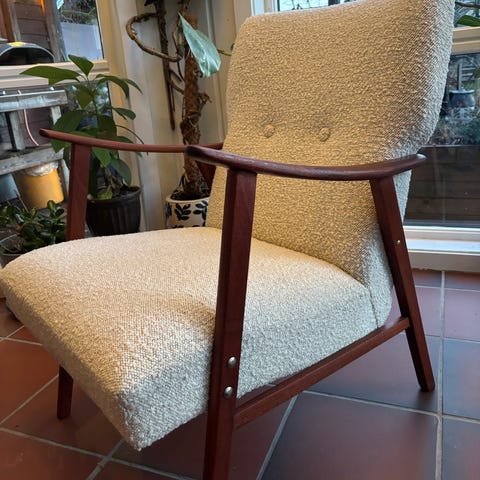 Pen og komfortabel teakstol fra 1960-tallet, trukket i ullstoff. Et møbel som passer perfekt både i moderne hjem og i et mer retro interiør.