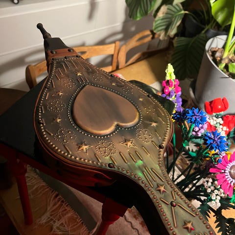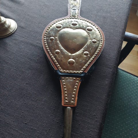 Pent brukt peisblåser/blåsebelg i lyst treverk med utskjæringer.