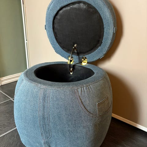En pent brukt puff fra Bohus selges. Den har stått i et walk-in closet så den er ikke brukt noe særlig til å sitte på. Fin fløyespute i mørk blå.