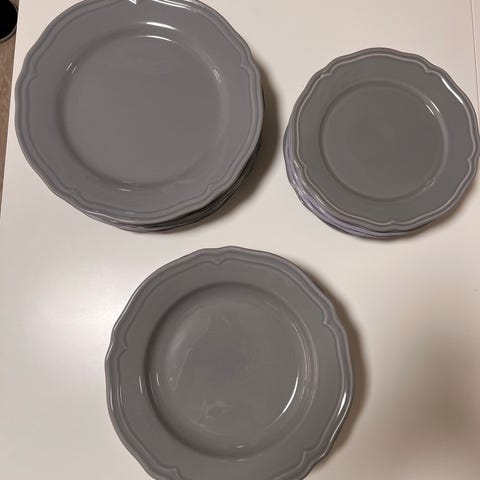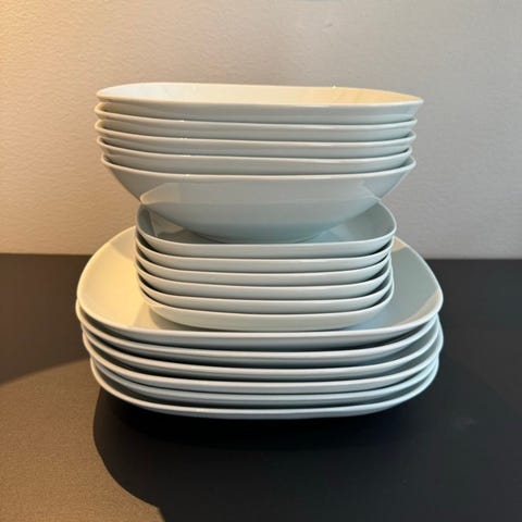 IKEA tallerken sett bestående av 10 stk hvite keramiske tallerkener. Tallerkenene har et kvadratisk design med lett opphøyde kanter. Tre av dem er pent brukt, resterende 7 er ubrukt.