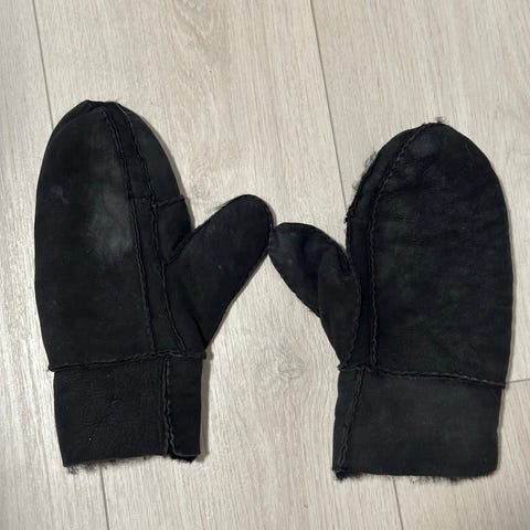 Lindex lammeskinnsvotter i svarbrun farge, foret med flees/syntetisk, størrelse M for dame. Lue med dusk i fuskepels. Luen er av akryl, polyester og ull. Lite brukt. Str M.