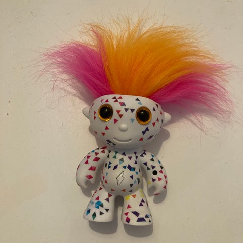 Trolls lekefigur med rosa hår, lilla sko og gul topp. Figuren er ca. 10 cm høy og laget av plastmateriale. Egnet for barn som lekeobjekt.