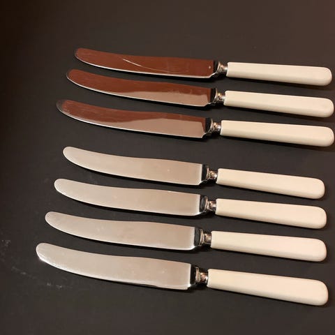 Retro, Geilo bestikk. 6 stk kniver i rustfritt stål. En av knivene har et smeltet merke på skaftet. Ellers er de i god stand. Pent brukt.