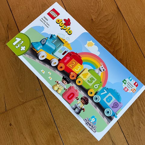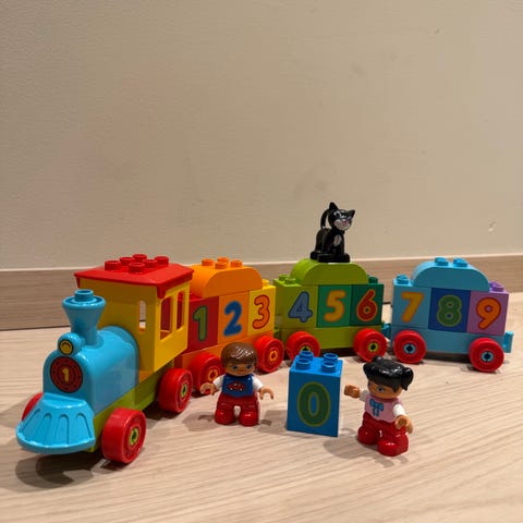 LEGO DUPLO togsett med fargerike klosser nummerert fra 0 til 9. Passer for små barn og hjelper med å lære tall og telling. Inkluderer tog og figurer i plastmateriale.