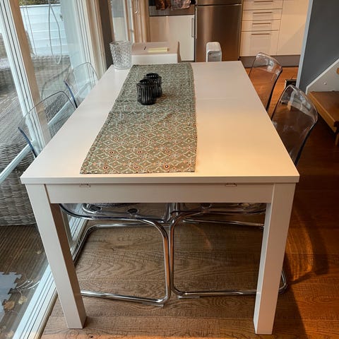 2 ileggsplater følger med og øker lengden med totalt ca 90cm. Totalt blir bordet da rundt 290cm.