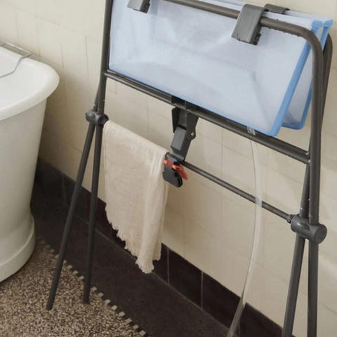 Stokke barnevogn med myk innredning i form av en pute med blå og gule detaljer. Passer til barn og gir ekstra komfort under bruk.