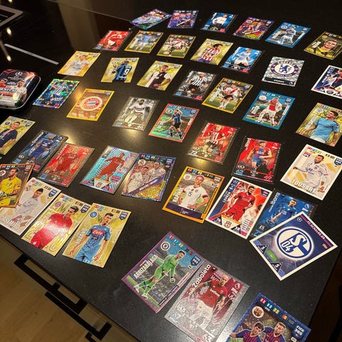 Samling av fotballkort med ulike spillere og design. Kortene viser forskjellige lagdrakter og spillere i ulike posisjoner. Passer for samlere og fotballentusiaster.