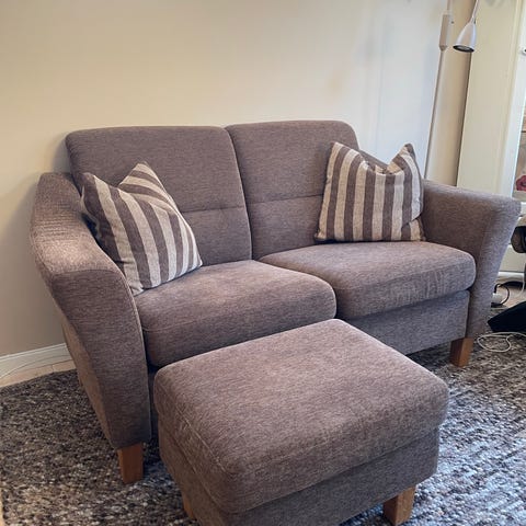 Pent brukt Brunstad hjørnesofa. Farge - lys beige med lys rosa striper. Lyse trebein. God sitte komfort. Kjøpt for ca 5 år siden. Bud mottas.