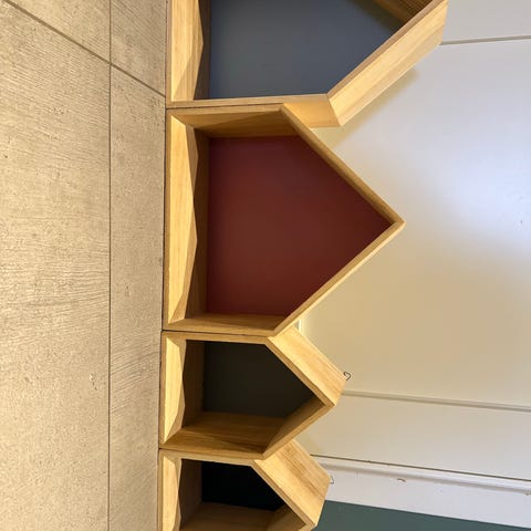 Søt liten hvit hylle til barnerom selges. Ser ut som et lite hus. Tre hyller og to skuffer. Trefargede ben.