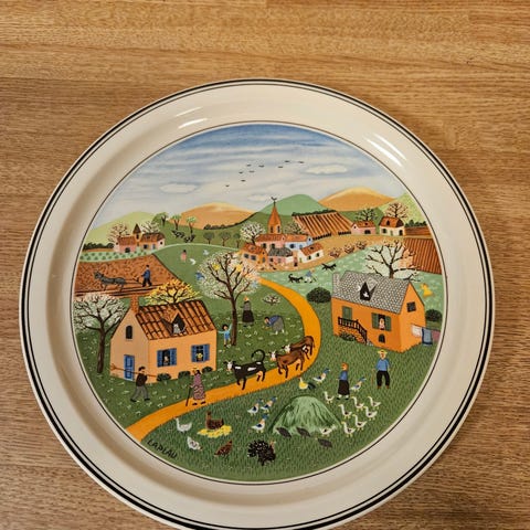 Villeroy & Boch Naiv - Les Quatre Saisons ( fire årstider)dekorativt fat med fire forskjellige årstidsmotiver. Fatene er laget i porselen og har fargerike illustrasjoner som viser landskap og aktiviteter knyttet til hver årstid. Passer til dekorasjon og samling.