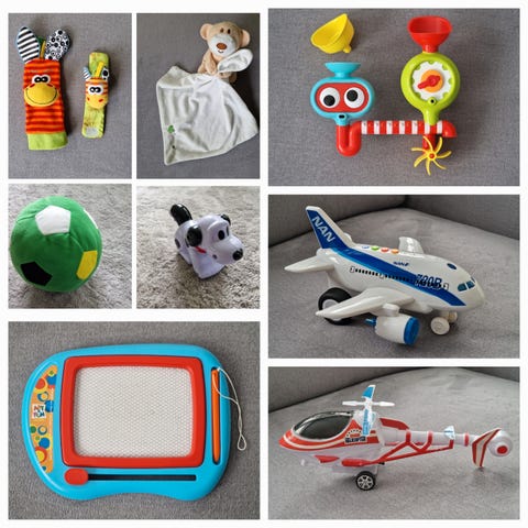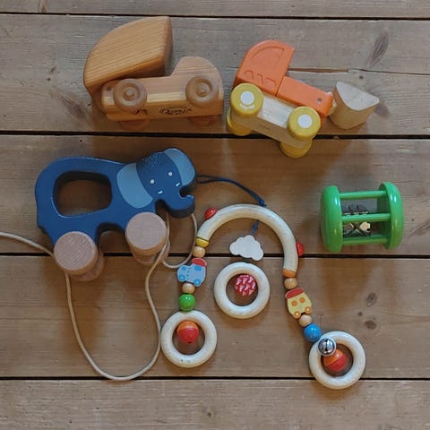 2 små treleker med hjul. Enkle å holde for små barnehender.