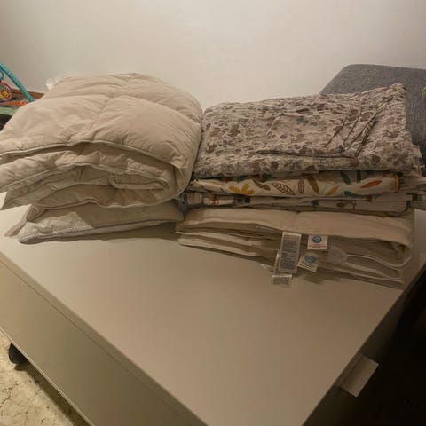 Er ei dundyne på 65x80cm. Det er fire sengesstt på 65x80, men på det ene settet er det ikke med sengetøy til pute. 5stk laken i str 40x80 og 1stk laken i str 69x38cm.