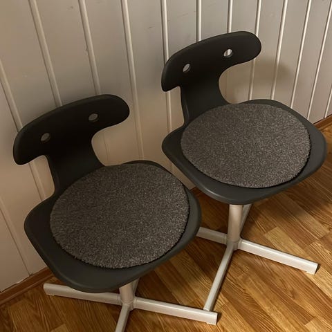 6 stk plaststoler, 3 hvite og 3 sorte. Gode å sitte på, enkle å lagre. Brukt som ekstrastoler når huset fylles opp.