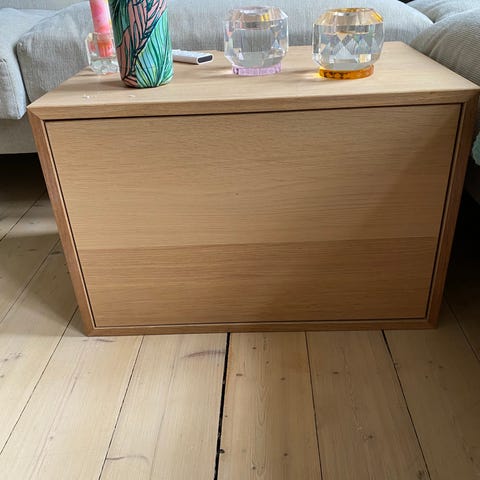 Bolia Case reol i hvit med eikefiner i dører og skuffer. Reolen er sammensatt av 4 seksjoner på 80 cm bredde. To seksjoner med 4 skuffer og to seksjoner med to dører. Høyden på skapskroget er 70 cm, total høyde inkls bein er 84,5 cm