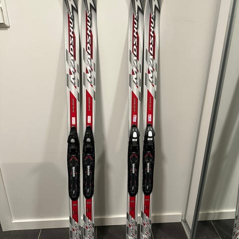 3. De røde/hvite skiene til høyre er av merket Madshus, er 110 cm og har rottefellebindinger.