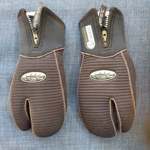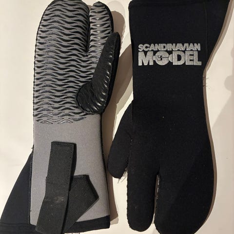 Scandinavian Model femfingret dykkerhansker. Det står størrelse L i dem, men de passer bra også til mine hender som nok er nærmere M.