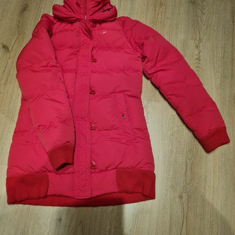 Jakken er 105 cm i lengde fra skulder ned ned, med glidelås nederst på begge sider.