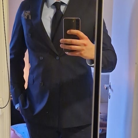 Oscar Jacobson dress, jakken kan kneppes begge veier. Kjøpt brukt, men passet ikke meg dessverre. Er som ny. Tror innerlommene er laget av lin.