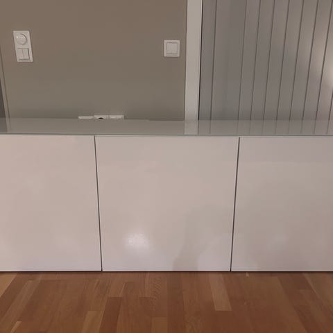 Selger denne skjenken i grå med gull knotter. Må hentes. Hyller inni
