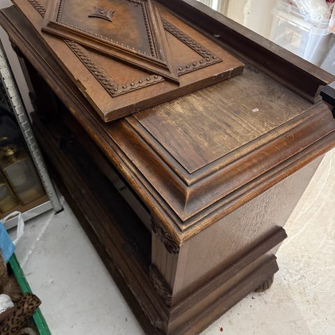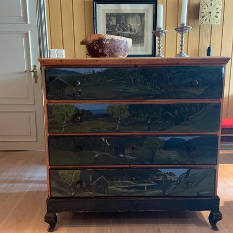 Selger en vakker, eldre kommode med buet front, dekorative inlegg og originale metallhåndtak. Dette er et møbel med klassisk uttrykk og fine detaljer som gjør seg godt både i moderne og tradisjonelle hjem. Kommoden er arvet, så treslaget og nøyaktig alder er ukjent, men den fremstår som et solid og kvalitetslaget møbel.