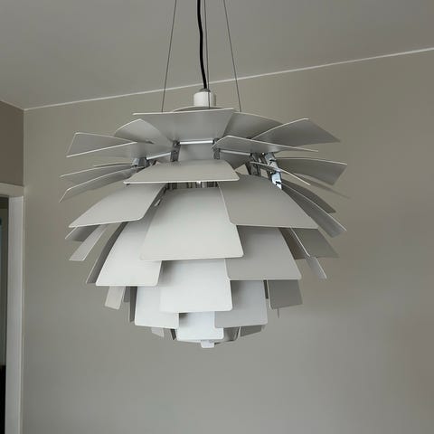 Lampen var montert i huset ved kjøp og fremstår som svært pent brukt. Ingen synlige riper, merker eller skader – fremstår som ny. Et elegant design som passer perfekt i gang, trappeoppgang, stue eller over spisebord.